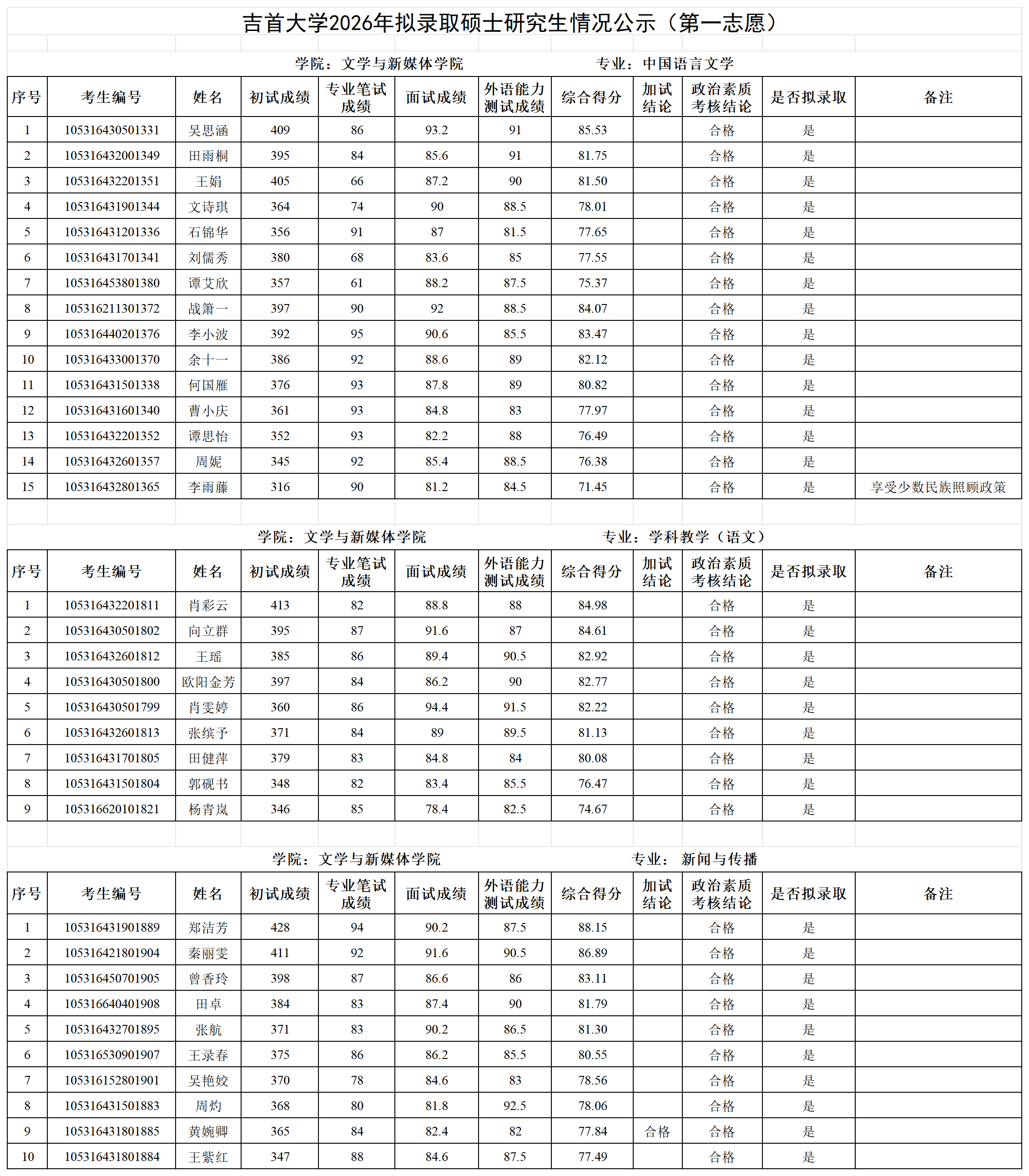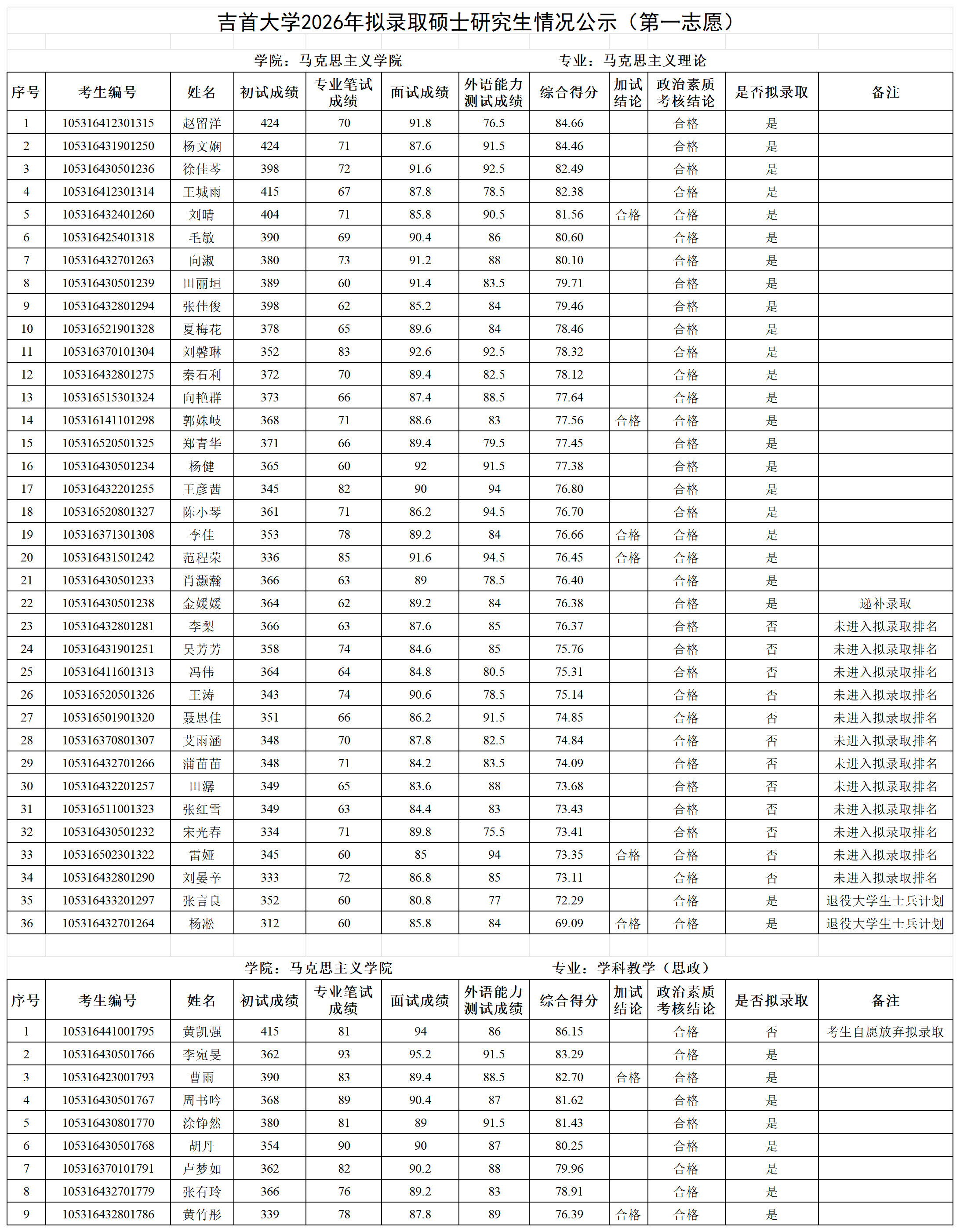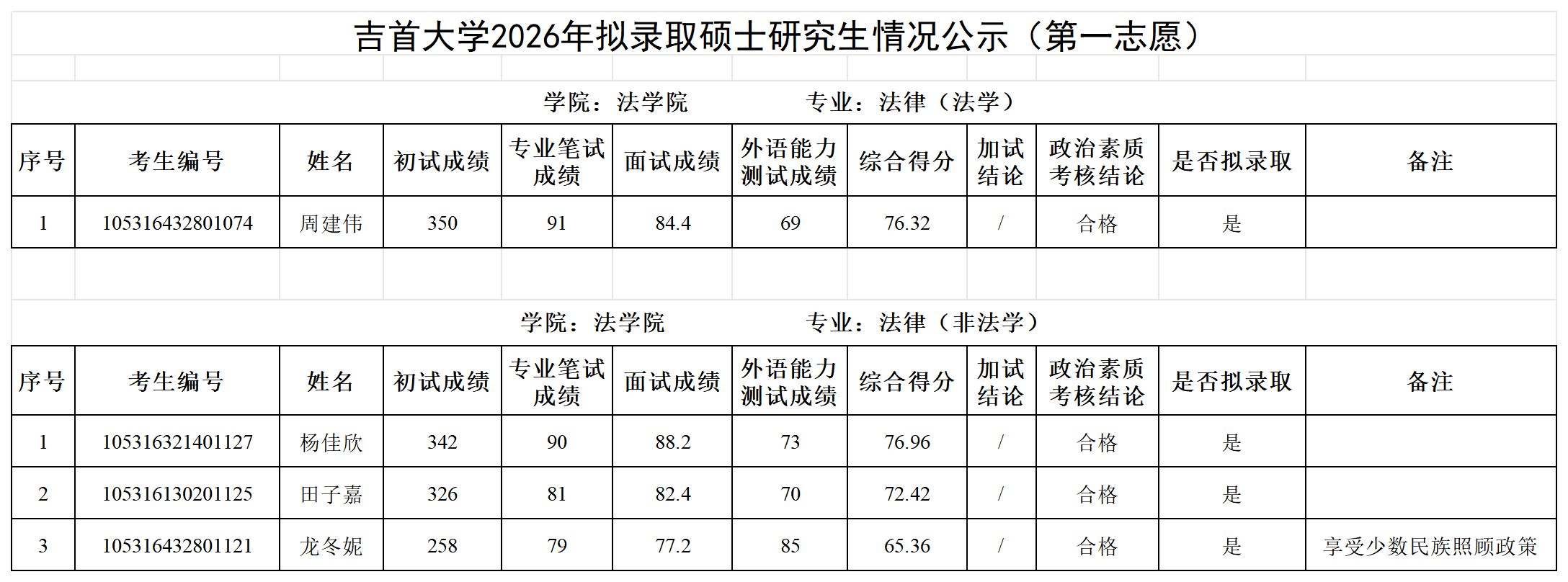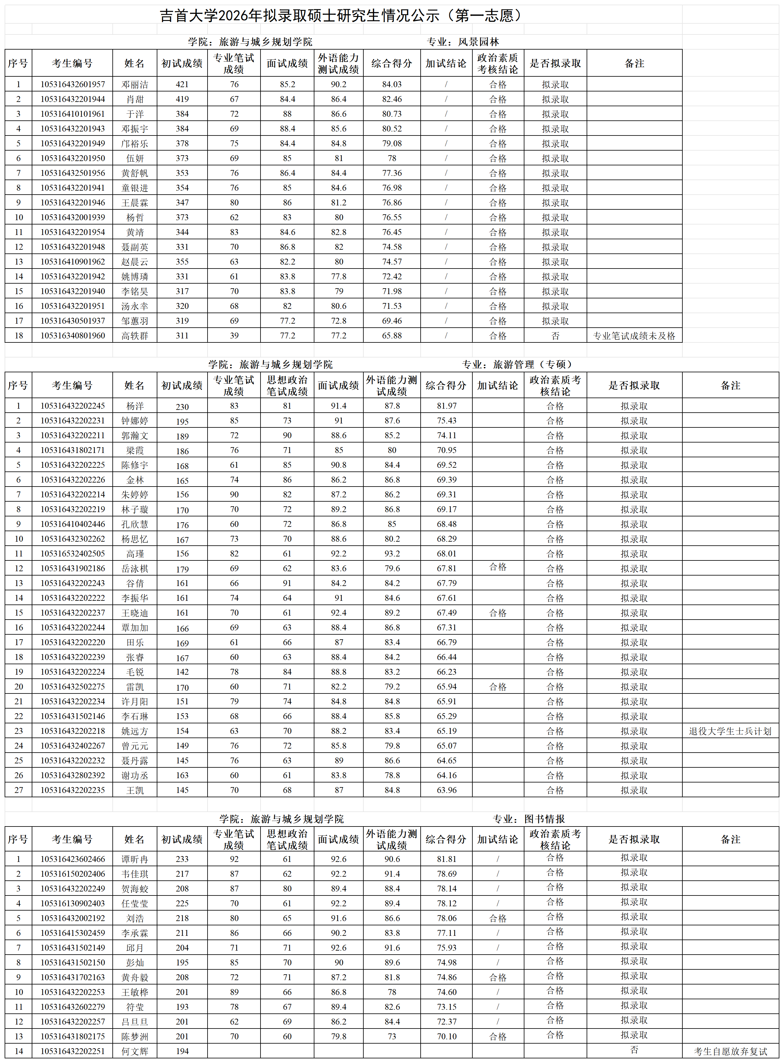 各位考生:吉首大学2026年拟录取第一志愿硕士研究生情况公示见附件(各学院已完成发布),公示期7日。公示期间如有疑问请以书面形式向吉首大学研究生院招生管理科反映,电话:0743-8561096;邮箱:jsuyzb@jsu.edu.cn。