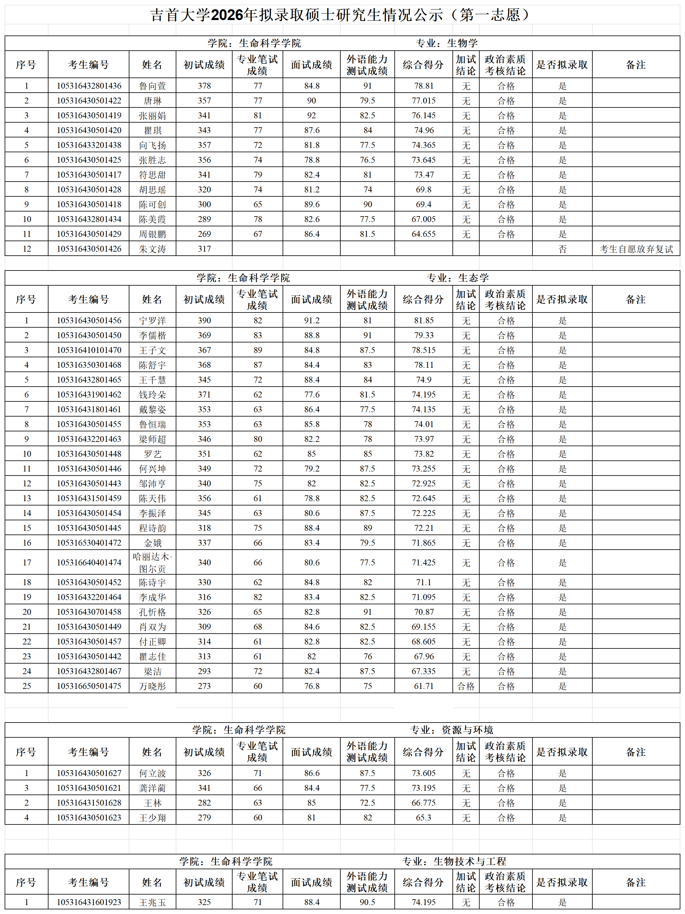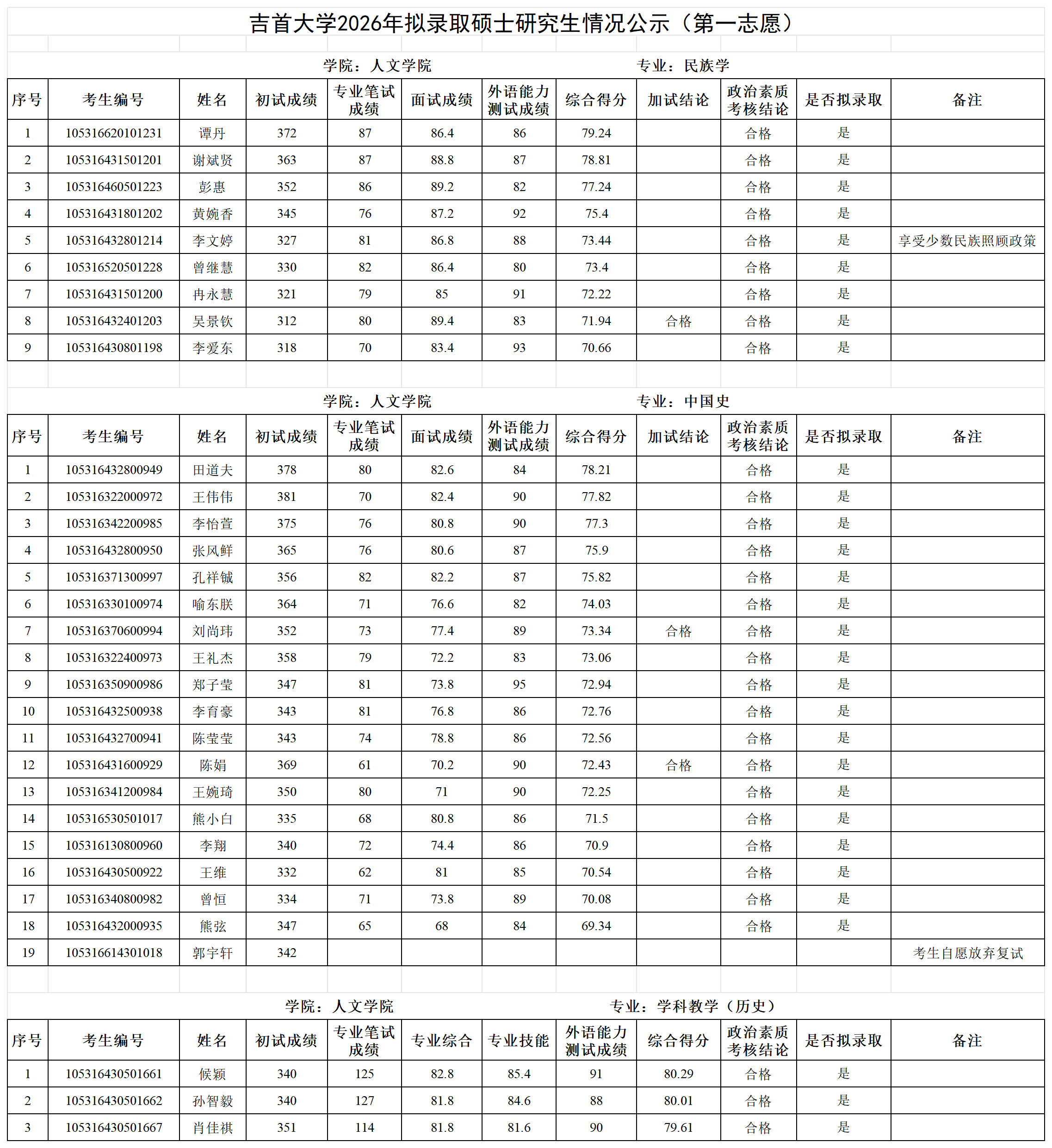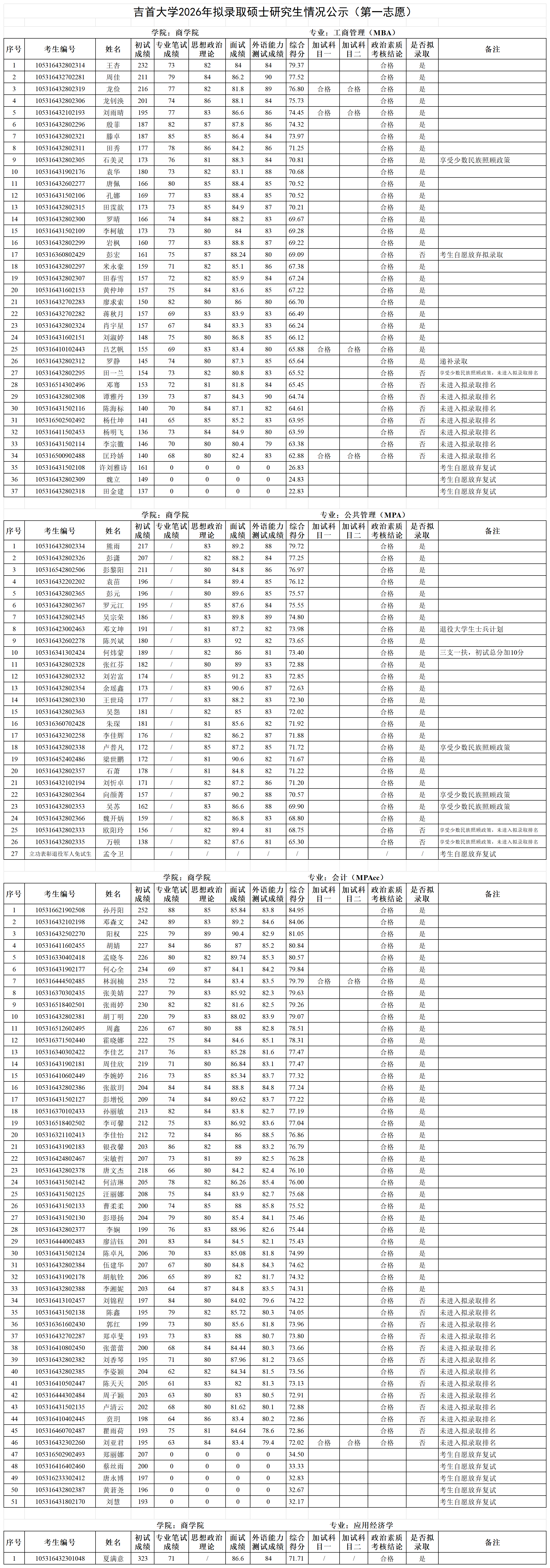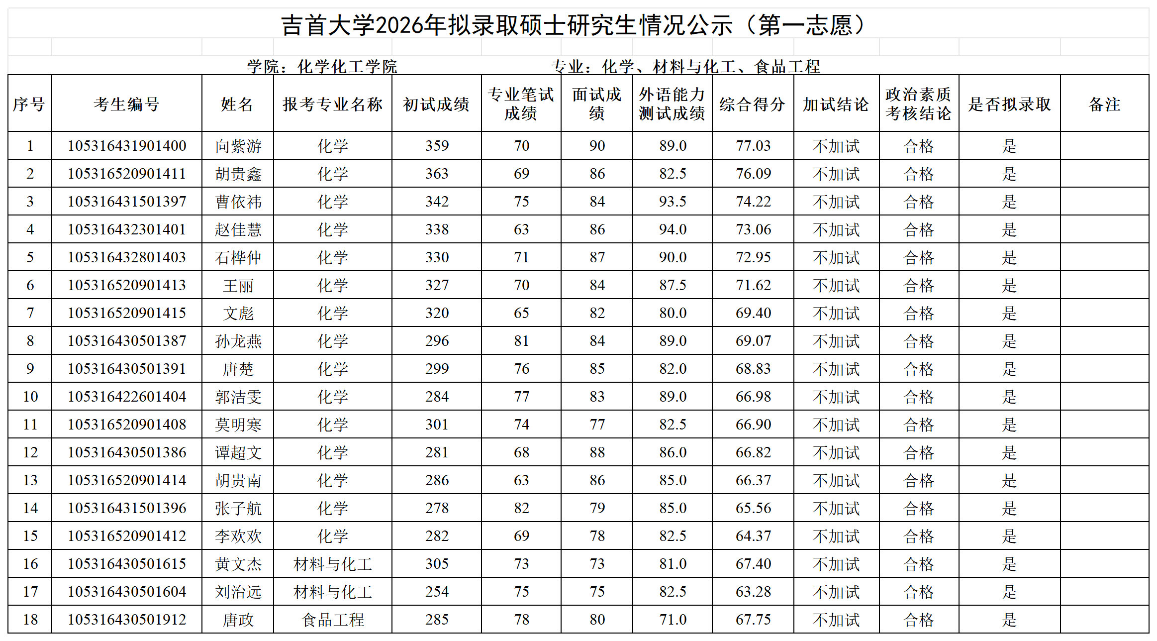 各位考生:吉首大学2026年拟录取第一志愿硕士研究生情况公示见附件(各学院已完成发布),公示期7日。公示期间如有疑问请以书面形式向吉首大学研究生院招生管理科反映,电话:0743-8561096;邮箱:jsuyzb@jsu.edu.cn。