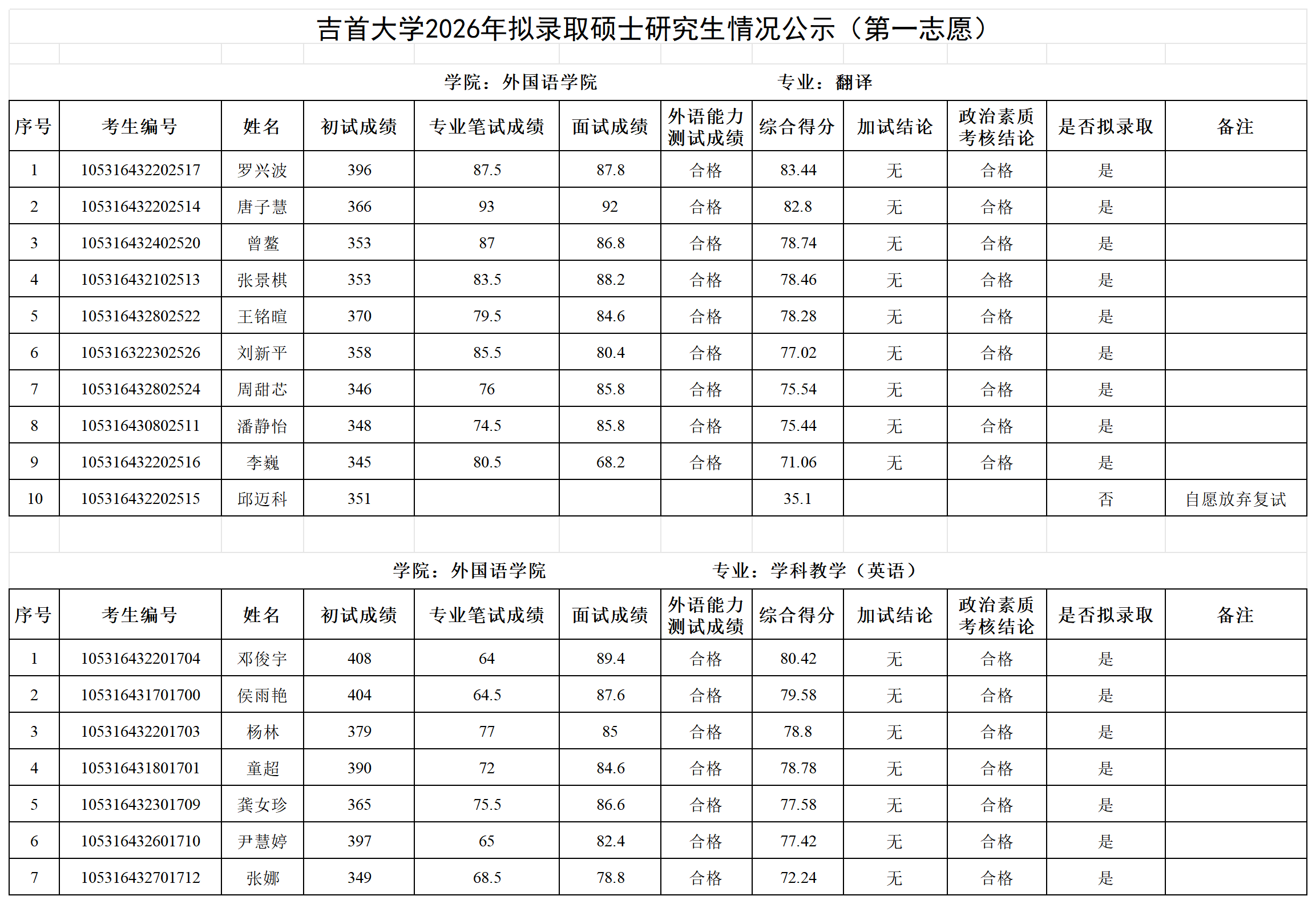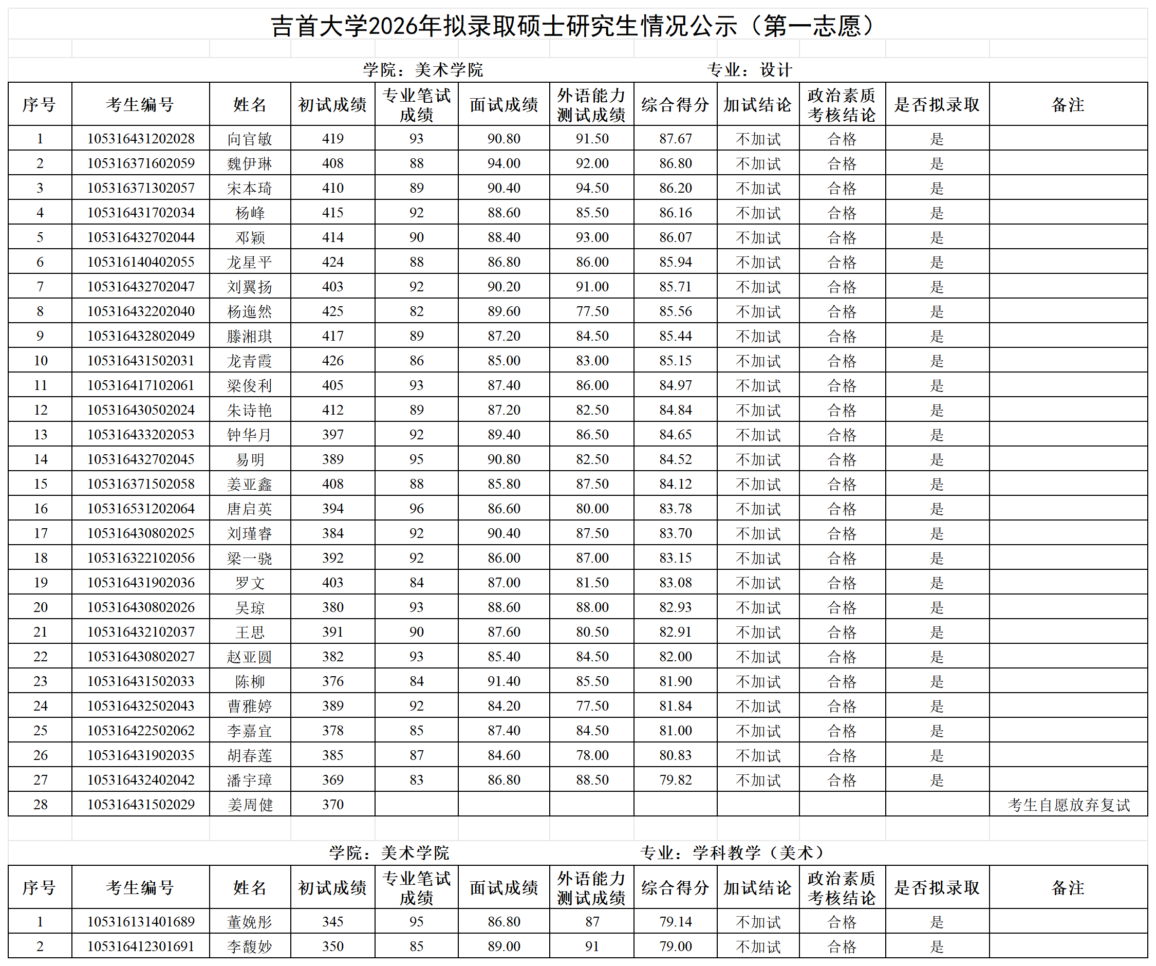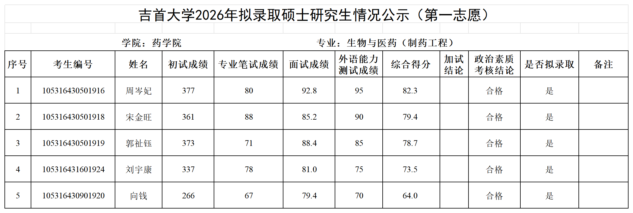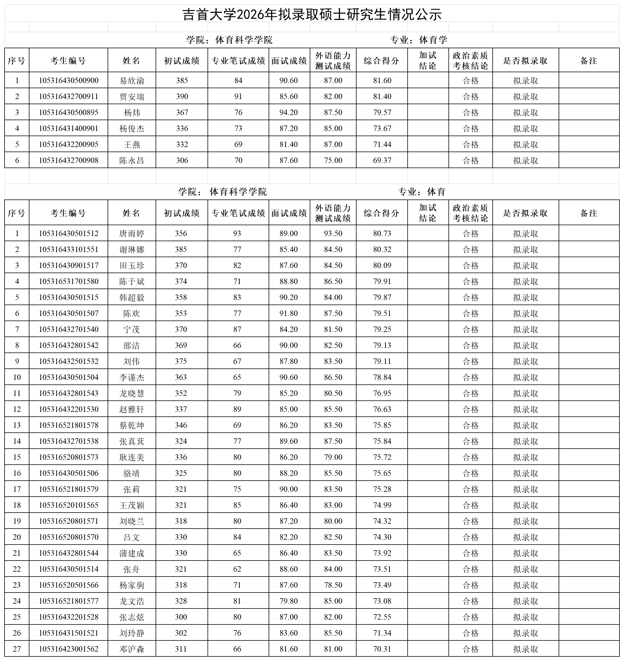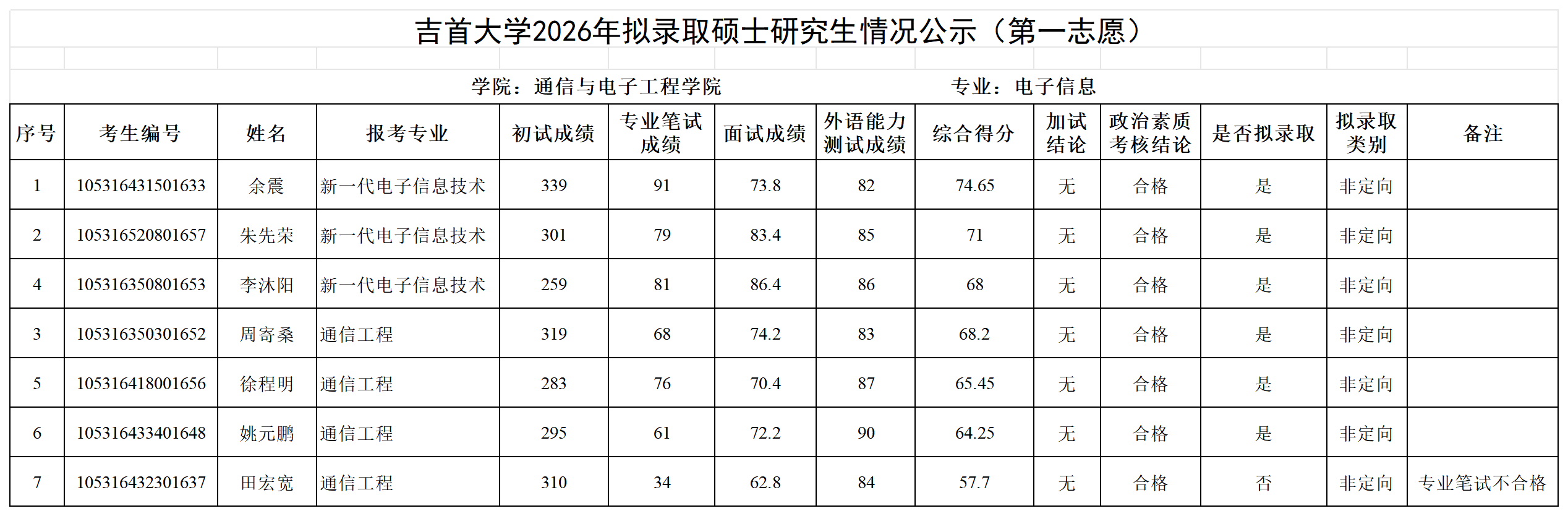 各位考生:吉首大学2026年拟录取第一志愿硕士研究生情况公示见附件(各学院已完成发布),公示期7日。公示期间如有疑问请以书面形式向吉首大学研究生院招生管理科反映,电话:0743-8561096;邮箱:jsuyzb@jsu.edu.cn。