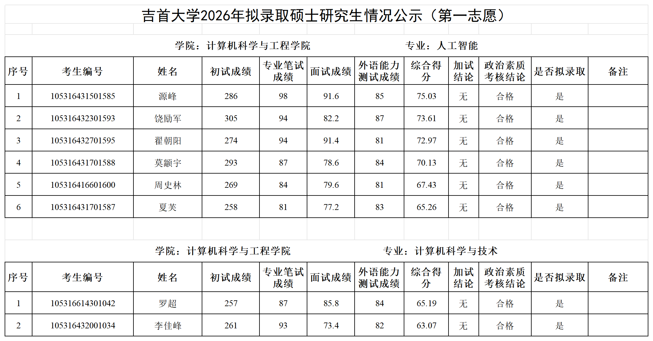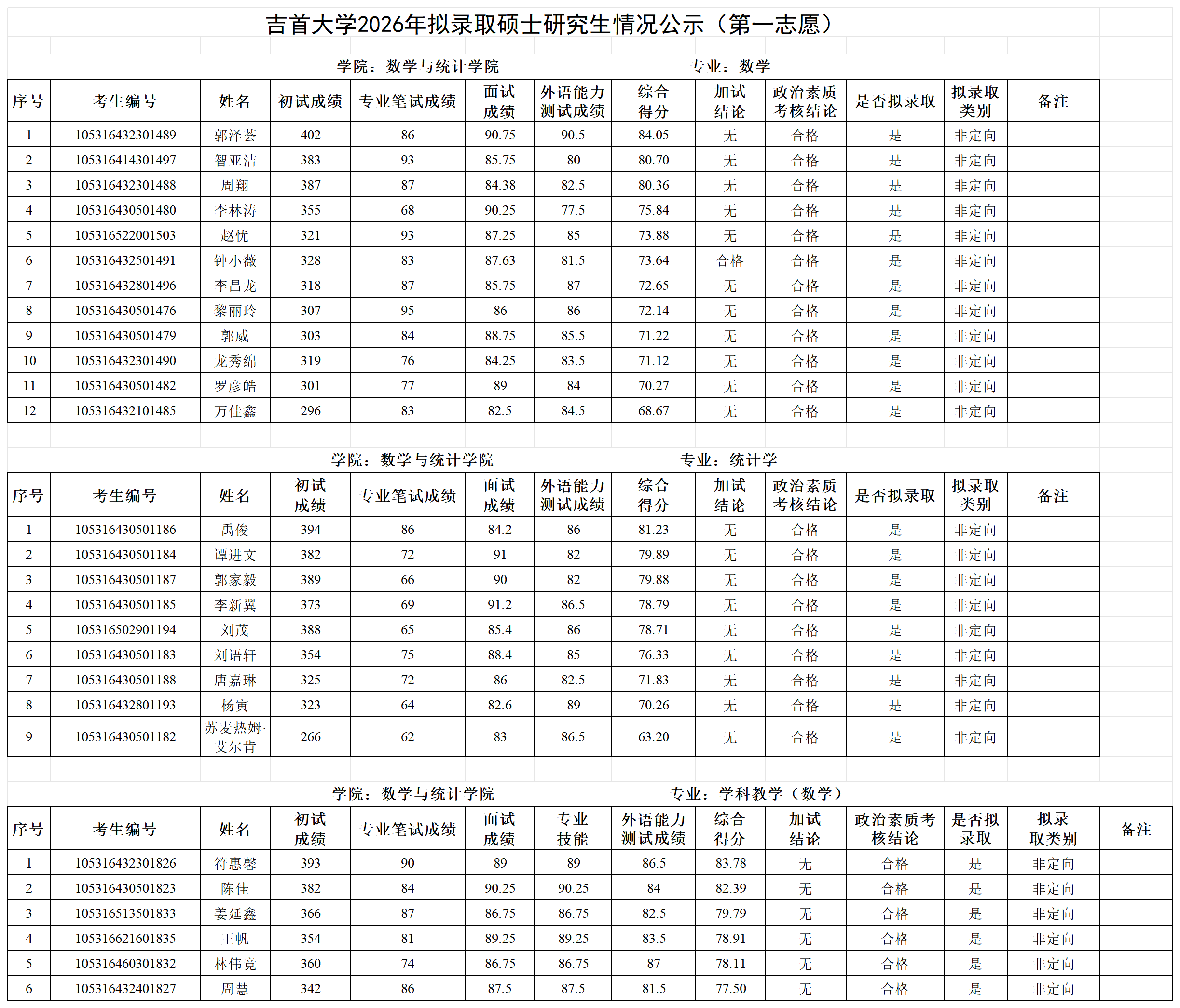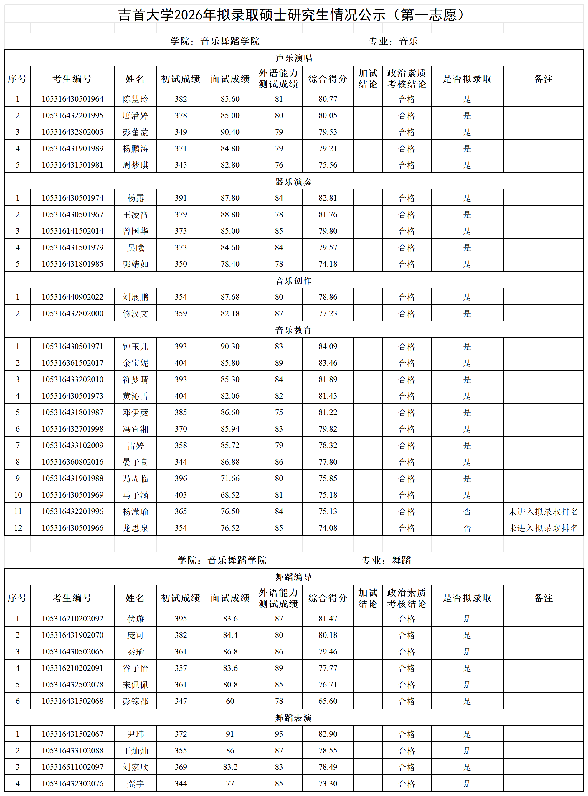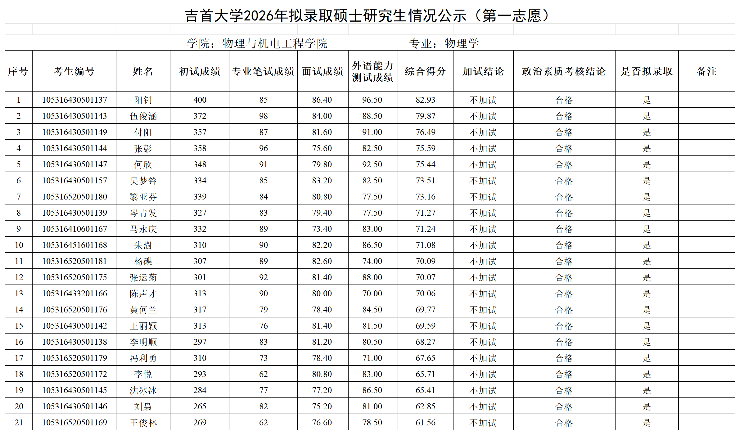 各位考生:吉首大学2026年拟录取第一志愿硕士研究生情况公示见附件(各学院已完成发布),公示期7日。公示期间如有疑问请以书面形式向吉首大学研究生院招生管理科反映,电话:0743-8561096;邮箱:jsuyzb@jsu.edu.cn。